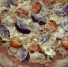 Do misy nalejeme vlažnú vodu pridáme cukor, olivový olej, 1 PL hladkej múky a droždie. Dôkladnerozmiešame a necháme postáť v teple cca 20min. Na pracovnej doske zmiešame múku a soľ, v strede sypkej zmesi urobíme jamku a nalejeme pripravený kvások. Vypracujeme hladké cesto a necháme kysnúť pod utierkou cca 30min. Cesto rozdelíme na 8 častí a vyvaľkáme na hrúbku cca 5mm. V miske zmiešame všetky ingrediencie na pesto s pretlačeným cesnakom a natrieme na pripravené kolieska pizze. Na vrch pridáme kúsky tuniaka, šalotku nakrájanú na tenké mesiačiky, strúhaný syr a posypeme pizza korením. Pečieme v rúre na papieri na pečenie cca 6-7min pri teplote 250 °C.